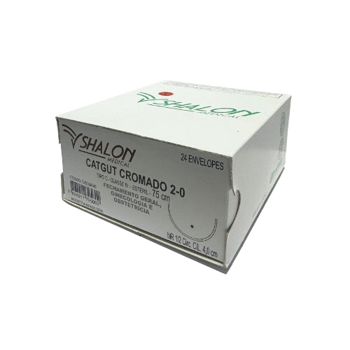 Sutura absorbible Catgut Cromado 2-0 de la marca Shalon, de 75 cm de largo, tipo C, CLASE IV, con aguja MR cilíndrica de 4,0 cm, 1/2 círculo. Ofrece buena manejabilidad, resistencia inicial moderada y absorción progresiva en tejidos. Se presenta en envase individual estéril y es recomendada para procedimientos quirúrgicos menores, ginecológicos y veterinarios. Grosor de hilo mas fino que el Cromado 0 y 1